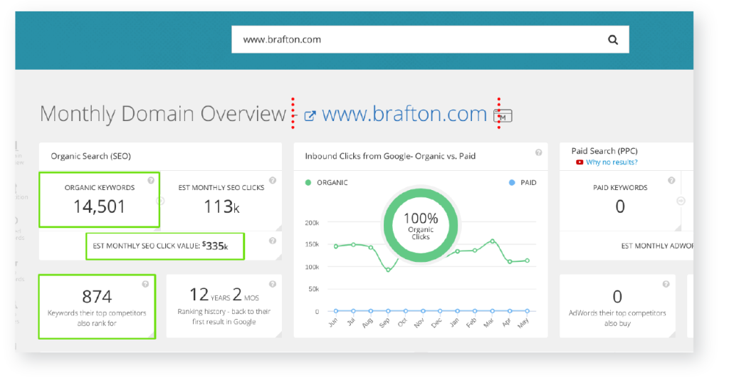 Oftentimes your pages will rank for variant terms in addition to your target keyword. This situation presents an opportunity to shift your focus to a better keyword, or confirm that you’re already targeting the right keyword. Run each URL through a tool that will tell you all the keywords your URL rank for, and in which positions.