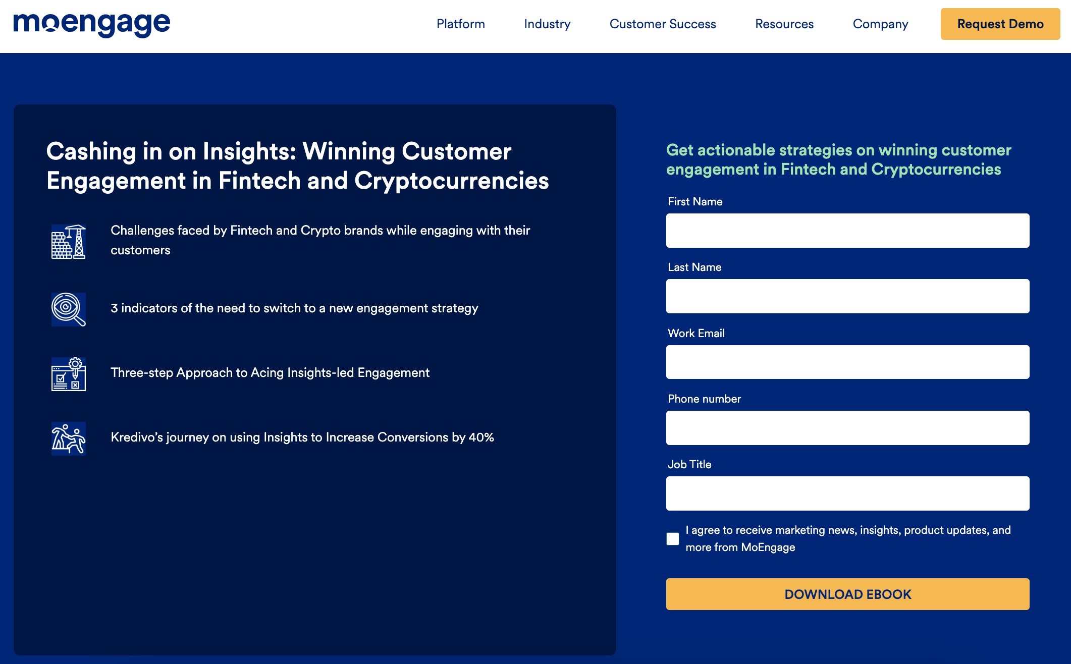 Each time a user downloads an eBook, that user shares their email address with MoEngage. But, they also share their job title, their full name and other valuable information that can be used to refine MoEngage’s targeted segmentation across marketing campaigns.