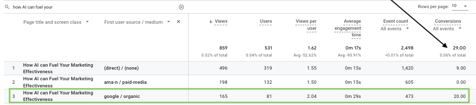 “How AI Can Fuel Your Marketing Effectiveness” was viewed 859 times, and Google / organic contributed to 19% of those views. This asset had 29 downloads, and 69% of them are attributed to organic traffic: