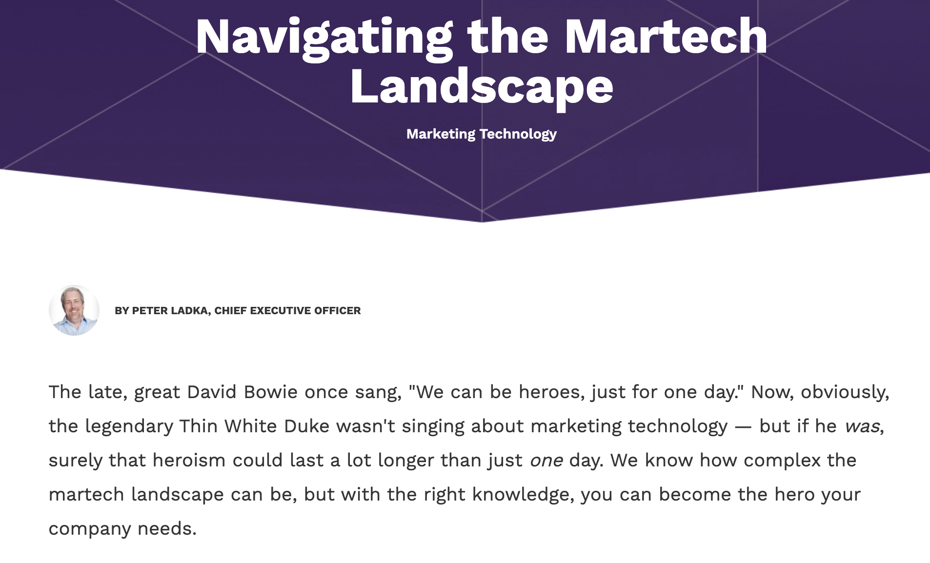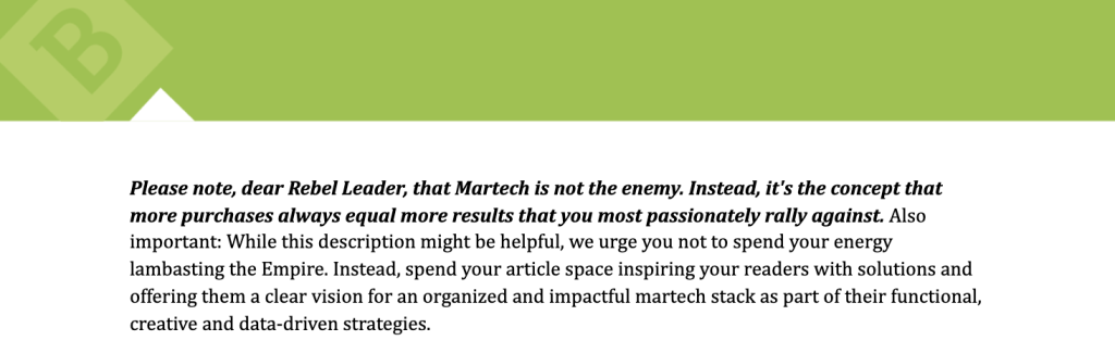 Enter the Rebel Leader. A clear-eyed messenger who strives to “disrupt the notion that more martech always equals better results.” They believe in “the power of simplicity over clutter—and focus over excess.” Their goal is “to liberate readers from the false beliefs espoused by The Empire and leave them free to achieve exceptional results with the right martech stack—not the biggest” …