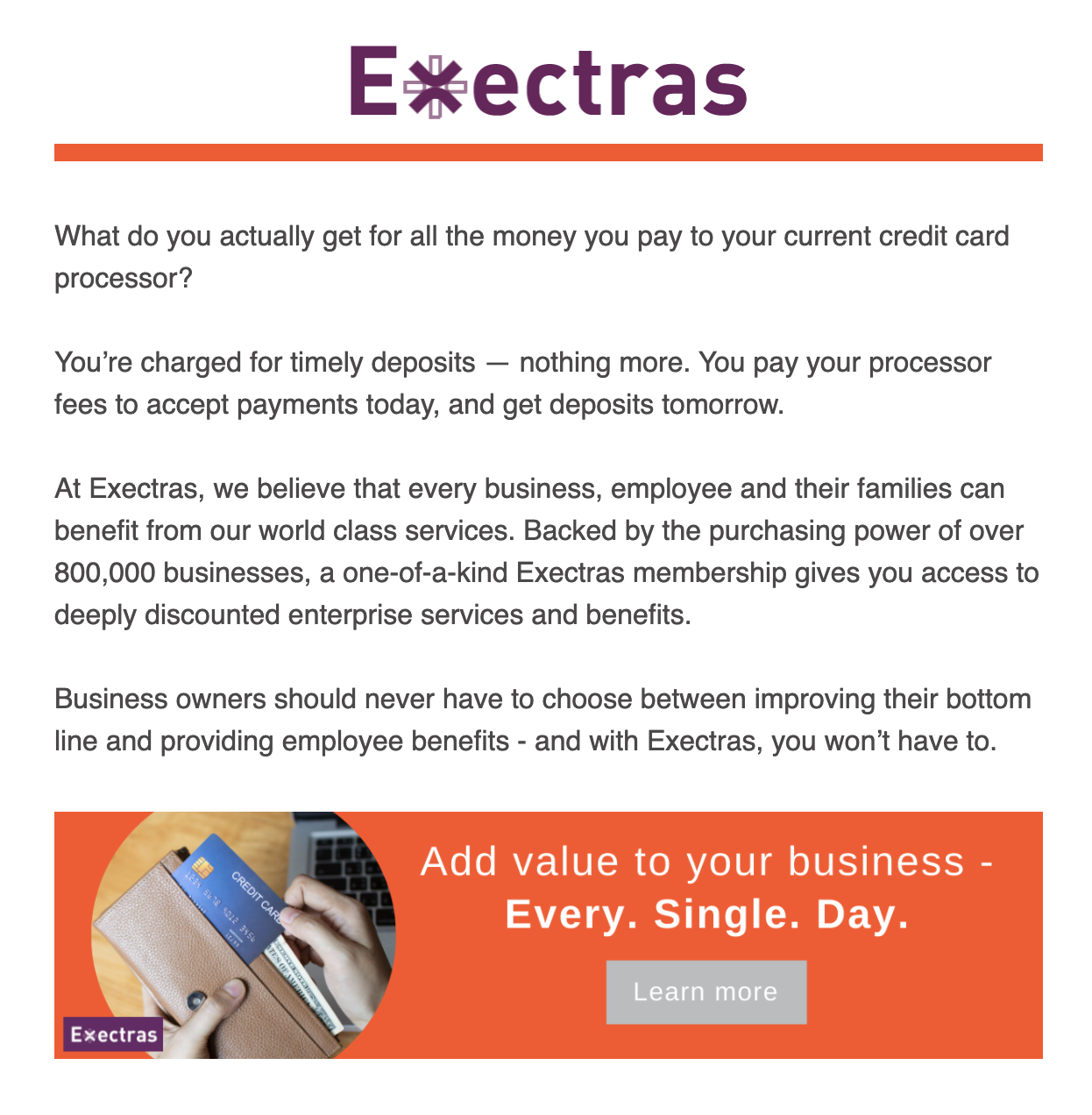 | Subject | Now entering a cashless world | *|FNAME|*, your business can get MORE VALUE for less | Say goodbye to credit card processing fees | How can your employees benefit from Exectras? | *|FNAME|*, how can you benefit from Exectras? | Say goodbye to credit card processing fees | Say goodbye to credit card processing fees | Special offer for business owners like you |