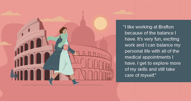“I like working at Brafton because of the balance I have. It’s very fun, exciting work and I can balance my personal life with all of the medical appointments I have. I get to explore more of my skills and still take care of myself.”