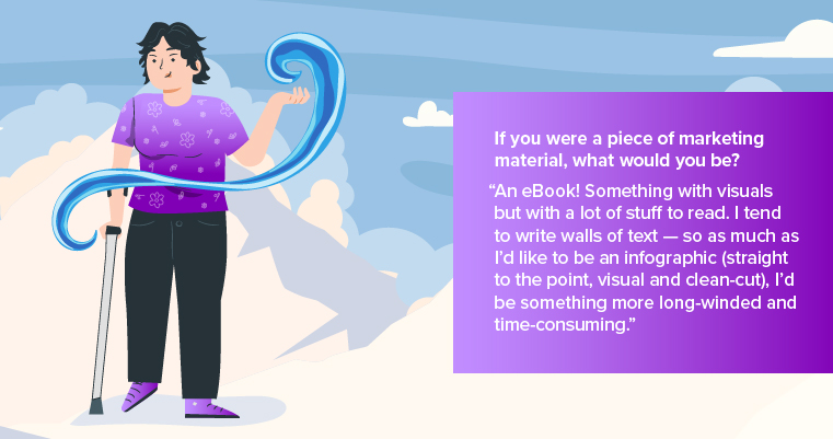“An eBook! Something with visuals but with a lot of stuff to read. I tend to write walls of text — so as much as I’d like to be an infographic (straight to the point, visual and clean-cut), I’d be something more long-winded and time-consuming.”