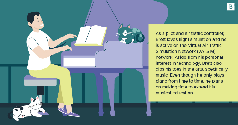 As a pilot and air traffic controller, Brett loves flight simulation and he is active on the Virtual Air Traffic Simulation Network (VATSIM) network. Aside from his personal interest in technology, Brett also dips his toes in the arts, specifically music. Even though he only plays piano from time to time, he plans on making time to extend his musical education. In the meantime, Brett says that he and his partner enjoy going to see musicals, with Hamilton and the Phantom of the Opera being some of their favorites.