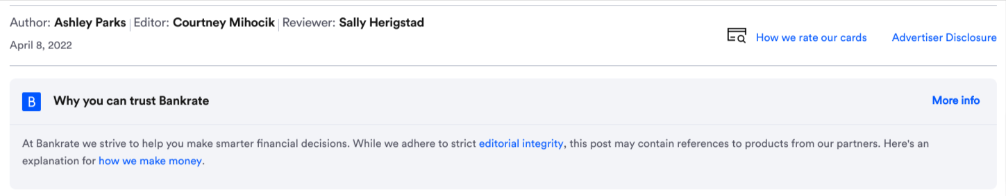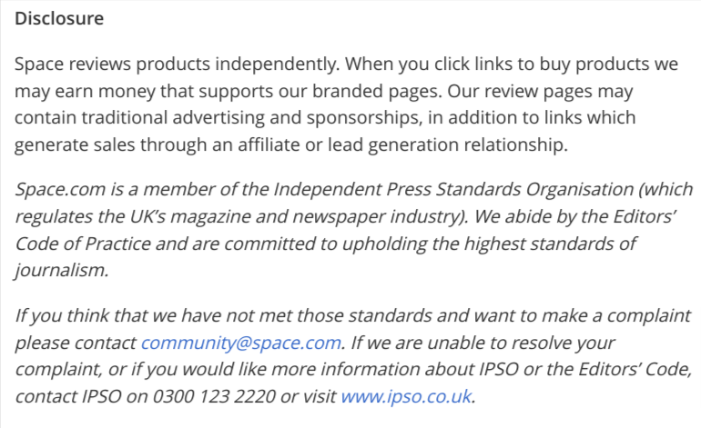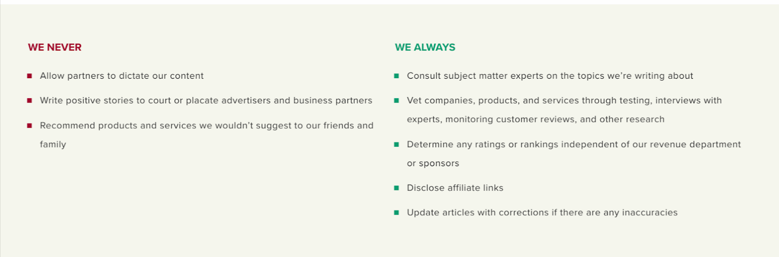 If you partake in affiliate link programs and you earn a commission when someone purchases a product via a link in your content, you need to say so in a clear way. At the top of your articles, you might have a short note about your participation in the program. I’ve seen a lot of websites clarify that the potential for them to earn a commission doesn’t impact the factuality of their reporting.