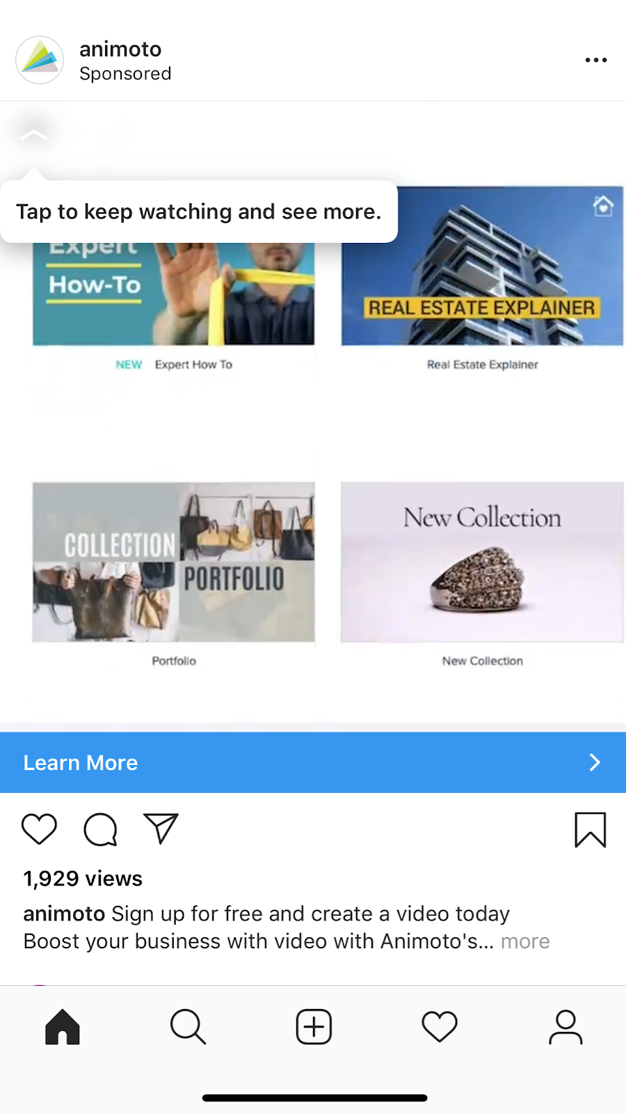In addition to cross-posting certain kinds of Facebook ads, Instagram includes its own options for ads within Stories and for video and photo ads that can be easily engaged with, such as the image above with its “Learn More” prompt.