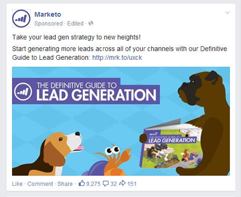 As an example, this Marketo post is typical of the boosted post ad format, created by pressing the “Boost Post” button in the Business Manager console of a Facebook Business Page: