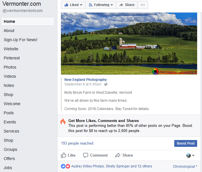 Facebook itself will often nudge users to boost posts in Business Manager, by showing analytics on a successful post and encouraging a boost to “Get More Likes, Comments, and Shares” for it, such as this photograph of bucolic New England: