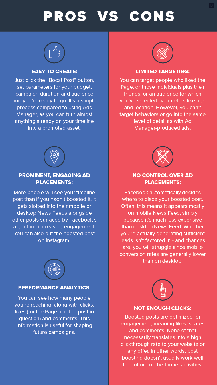 - Not enough clicks: Boosted posts are optimized for engagement, meaning likes, shares and comments. None of that necessarily translates into a high clickthrough rate to your website or any offer. In other words, post boosting doesn’t usually work well for bottom-of-the-funnel activities.