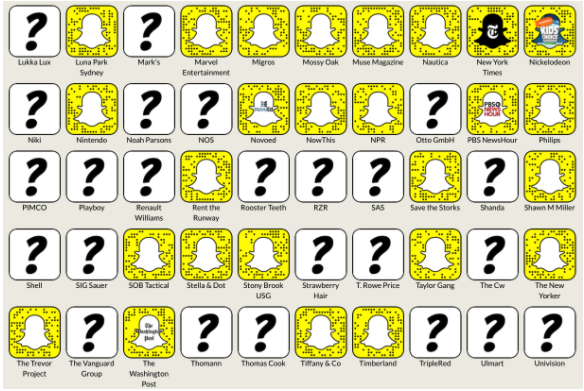 Just take a look at this image from a site that lets you look up the Snapchat account for a personality or brand. The question marks show brands that aren’t currently using the app.