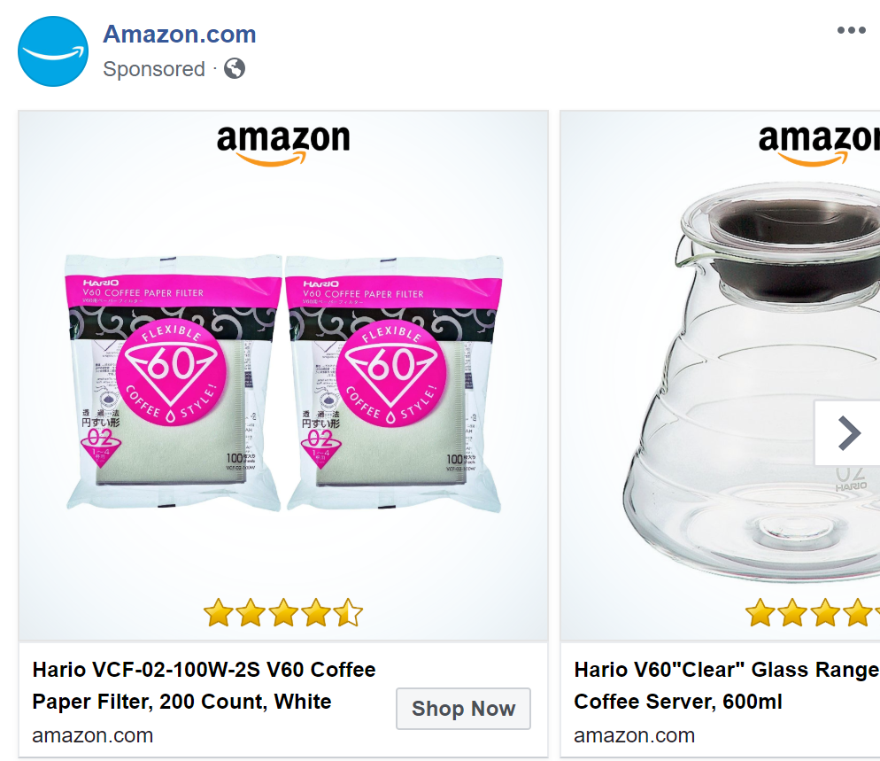 This ad appeared in my news feed as I was checking through recent posts from my friends and family. A week prior to seeing this ad, I had been pricing out a new set of coffee-making tools for my home, and I put these filters and pot in my cart. Here, I’m not only reminded of the products but also their reviews. If I was ready to make a purchase, I could simply click the “Shop Now” button to continue my buying journey.