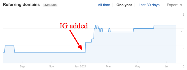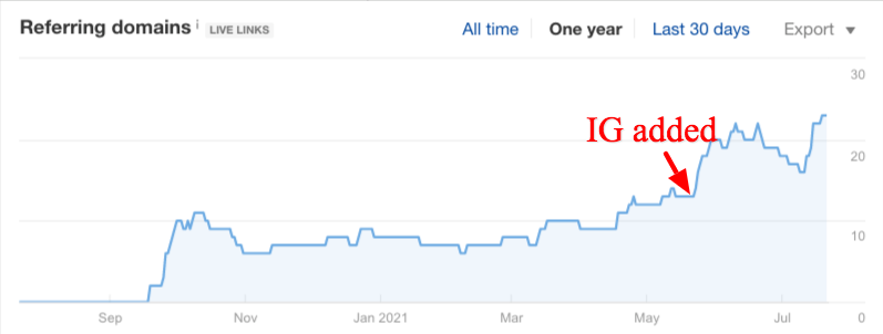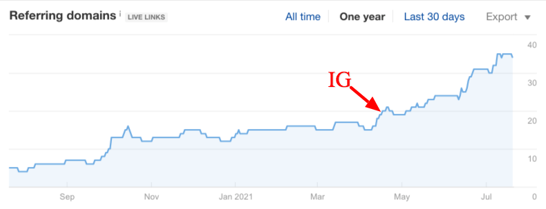 After we added the infographic to the blog, in most cases, it started accruing more backlinks per month. On average, the blogs where we added infographics this year are now accruing ~3.1 new referring domains per month.