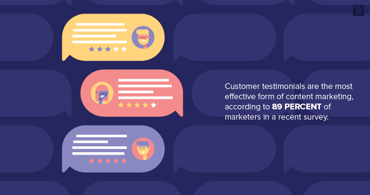 Putting a testimonials page on your website is worth considering. In fact, according to a recent Local Consumer Review Survey by Bright Local, consumers read about 10 online reviews before they feel like they can trust a business. These star ratings can help your business, but an effective testimonial can take things a step further. On top of that, a B2B Content Marketing Trends Report shows that customer testimonials are the most effective form of content marketing to 89% of marketers.