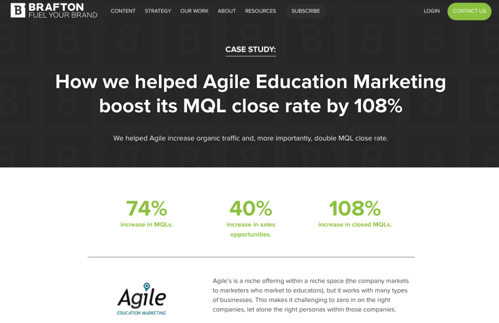 At the start of this case study showing how we helped Agile Education Marketing boost its MQL close rate by 108%, the statistics are front and center.