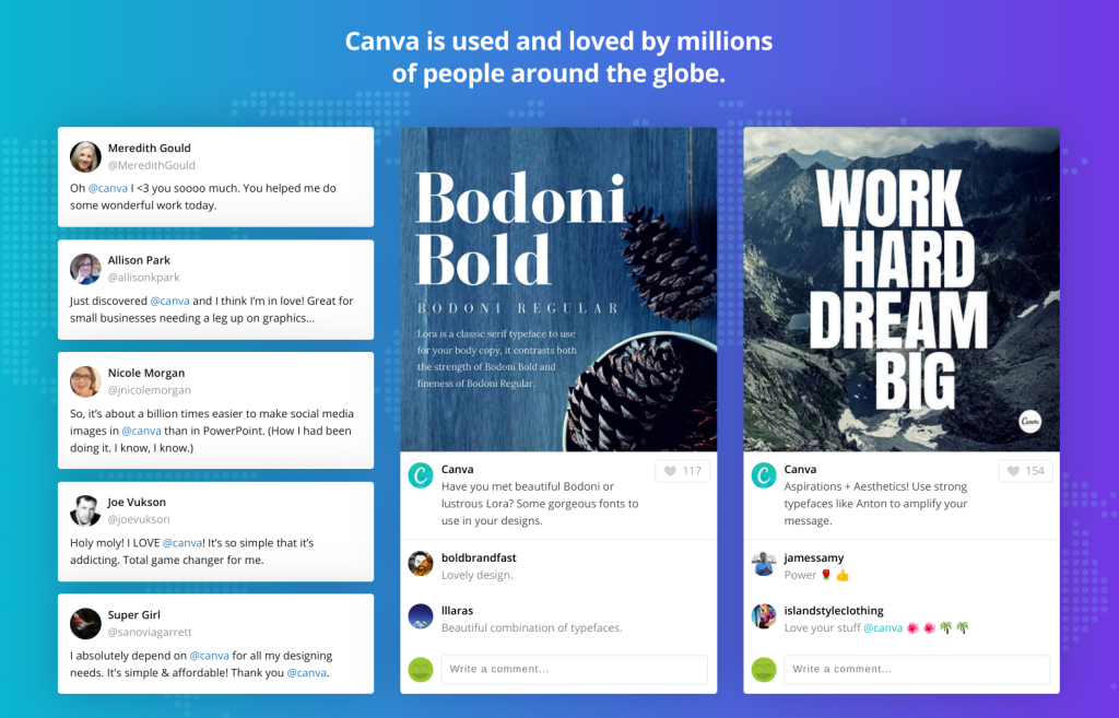 If you screenshot the posts or save the direct links, you can seamlessly weave them into other marketing materials. For instance, Canva embeds Twitter posts on their about page as a form of social proof: