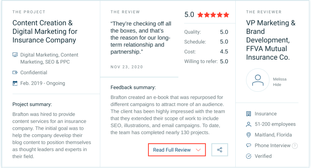 Customer ratings can include a simple 5-star rating, or reviewers can add written testimonials to provide more detail about their experience with the brand. In some cases, they can also include additional details about their own background, as shown in this 5-star review of Brafton’s services on Clutch: