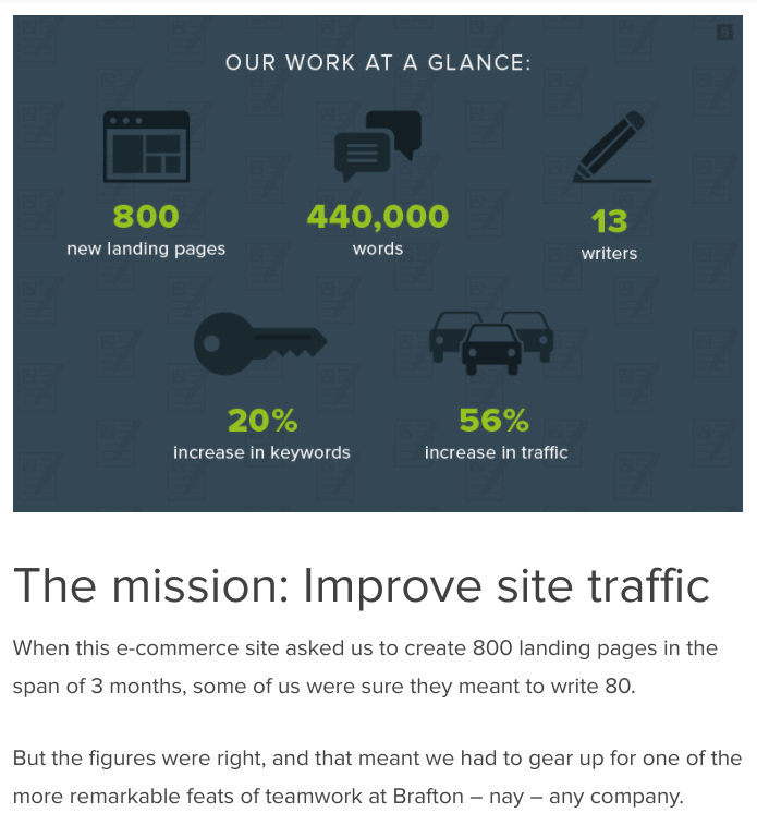 Below is a snippet from one of our recent success stories, “How content helped an online grocery store increase site traffic by 56%.”