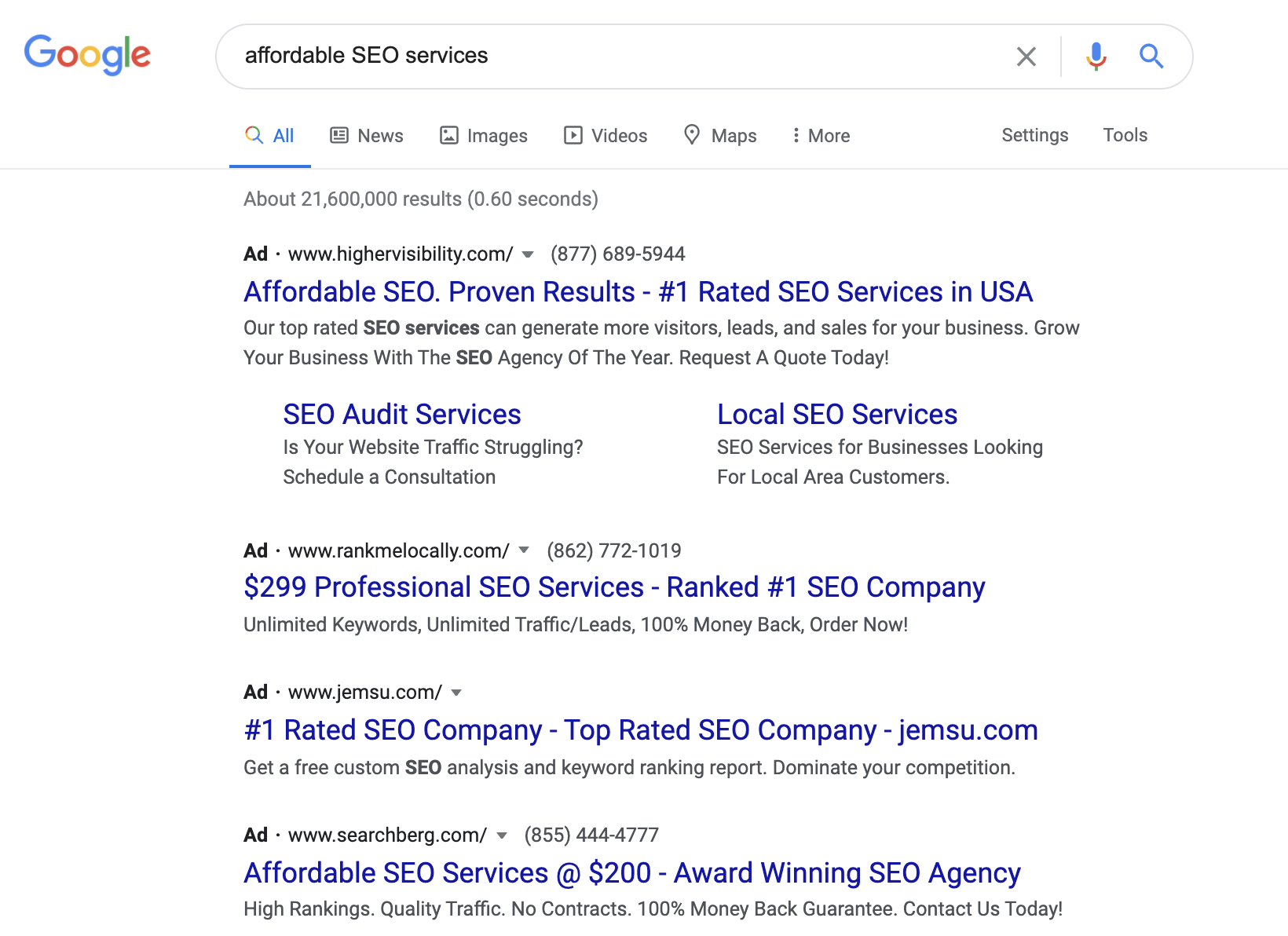 This hammers home the point: Google can’t figure out what type of content people want to see when they search for “affordable SEO services.”