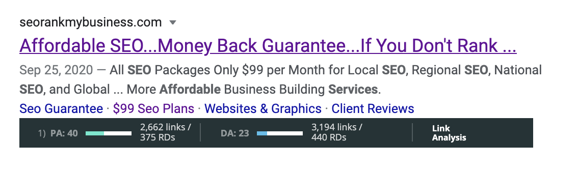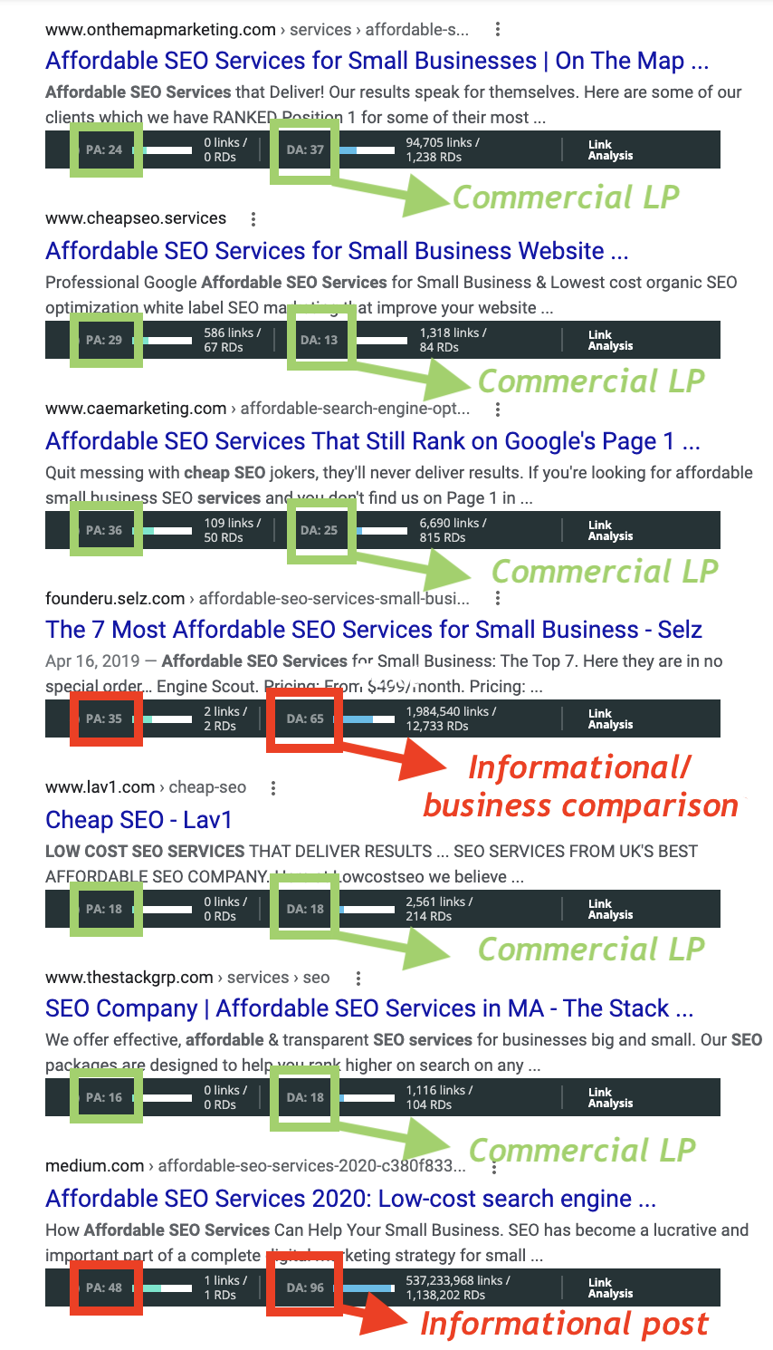 This confusion stems from mixed signals. There’s plenty to indicate commercial intent—paid search results and the words “affordable” and “services.” At the same time, most of the commercial landing pages ranking for this term have very low DA, and the PAs are unimpressive.