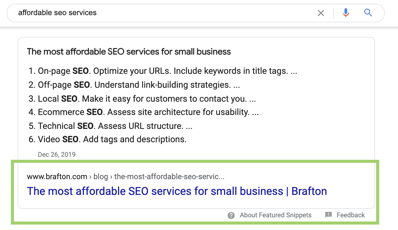 It involves a single keyword (affordable SEO services). We ranked third for this keyword in search results and, by all appearances, we could and should have been ranking first. Upon closer inspection, we thought better of trying to slide into the No. 1 spot. The result of our doing nothing: We earned a featured snippet and saved a few hundred dollars in the process.
