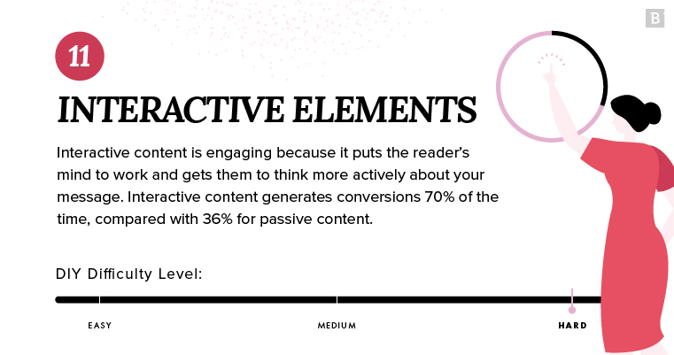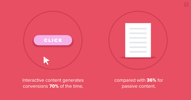 Interactive content is engaging because it puts the reader’s mind to work and gets them to think more actively about your message. By giving your site visitors something to do other than read or watch a video, they’ll stay around longer and absorb more of your branded information. In fact, interactive content generates conversions 70% of the time, compared with 36% for passive content.