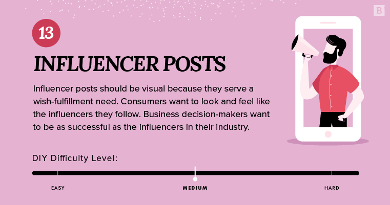 Influencer posts should be visual because they serve a wish-fulfillment need. Consumers want to look and feel like the influencers they follow. Business decision-makers want to be as successful as the influencers in their industry.