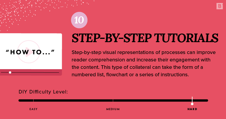 If your brand publishes how-to blog articles and eBooks, you can repurpose them as graphical assets. Like an infographic, step-by-step visual representations of processes can improve reader comprehension and increase their engagement with the content. This type of collateral can take the form of a numbered list, flowchart or a series of instructions. Plus, you can add brand colors and logos to promote your organization’s leadership of thought.