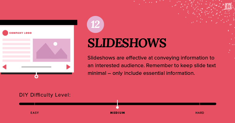 For many people, slideshows are like a non-chemical sleep aid. They remind us of boring college lectures and business meetings that could have been emails. Nevertheless, slideshows can still be effective at conveying information to an interested audience. You probably won’t use a SlideShare presentation at the top of your marketing funnel, but it may have a place further down. Remember to keep slide text minimal – only include essential information.