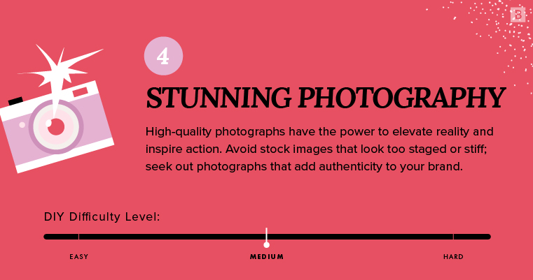 If your company doesn’t have the resources to hire a photographer, stock photo sites can provide beautiful photos that enhance your marketing messages. Avoid stock images that look too staged or stiff; seek out photographs that add authenticity to your brand.