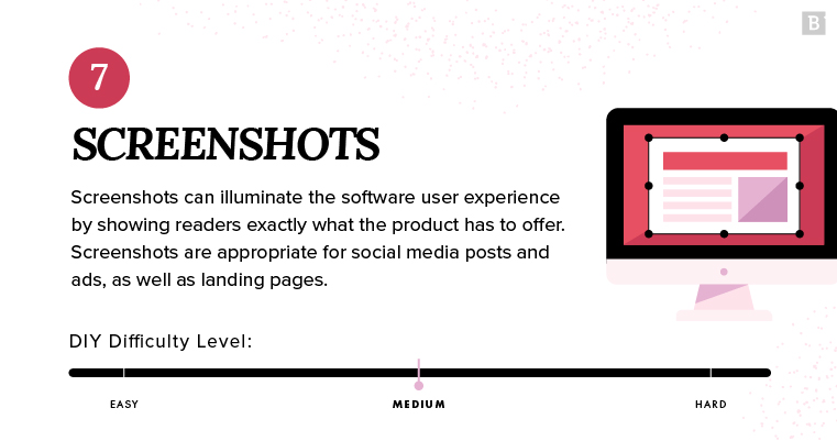 Screenshots can illuminate the software user experience by showing readers exactly what the product has to offer. Screenshots are appropriate for social media posts and ads, as well as landing pages. Why tell your audience about your product when you can show it to them?
