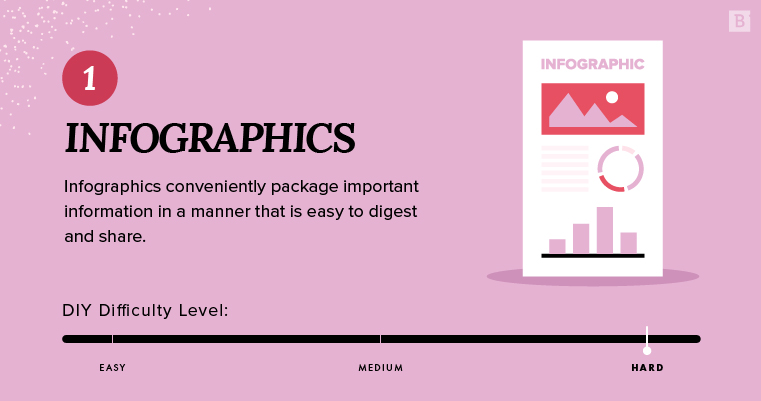 Business decision-makers and consumers make purchases based on data, but not everyone has the time to read through lengthy reports and research. Infographics conveniently package important information in a manner that is easy to digest and share. You can embed them within blog articles, eBooks and case studies to give your readers’ eyes a break from blocks of text; or share them on social media platforms to increase the reach of your messages.