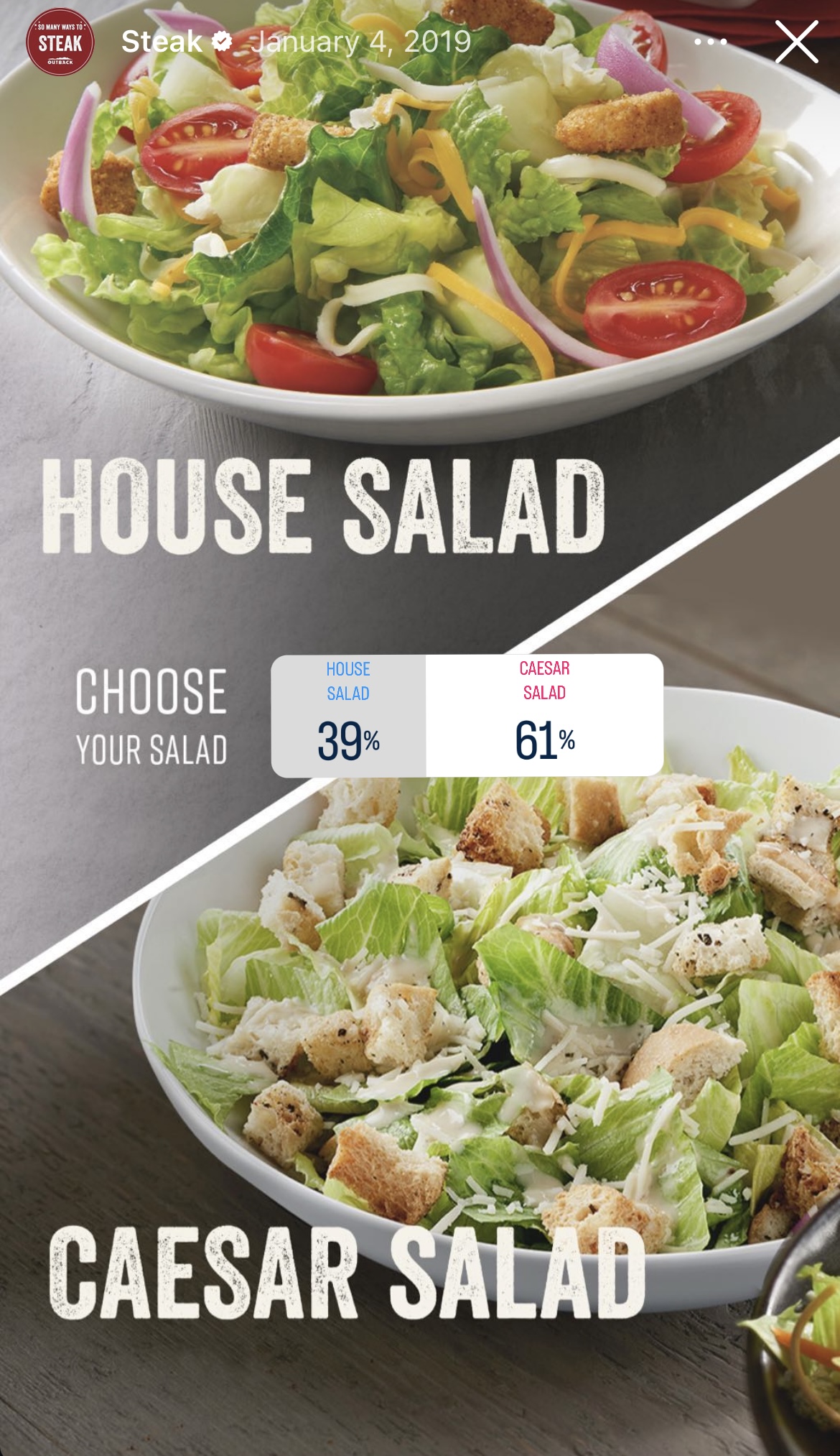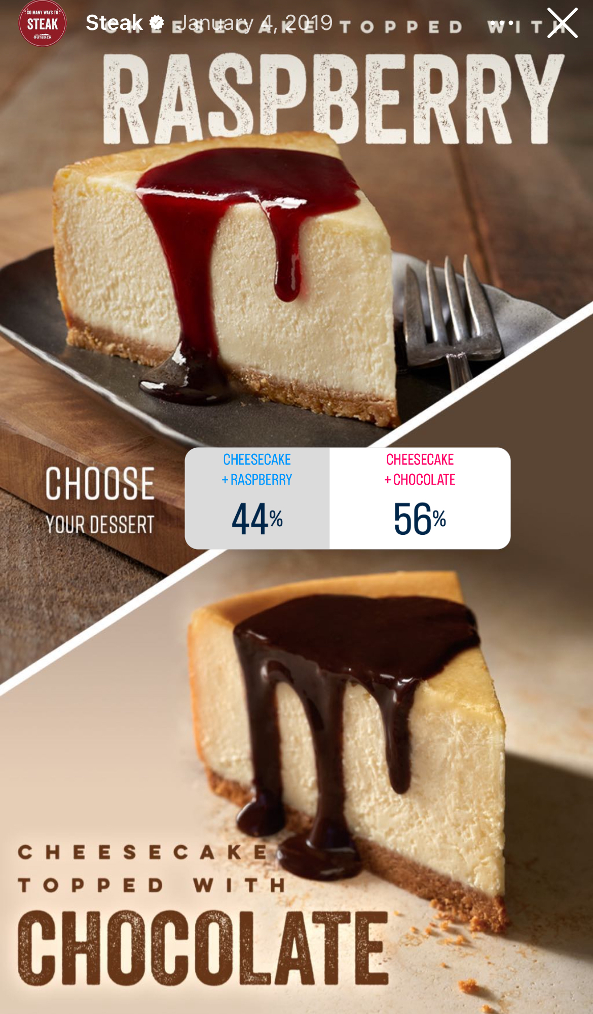 Or you can test how Instagram Stories — photos or videos that disappear after 24 hours but include interactive features like polls and stickers — perform with your audience. Outback Steakhouse does this well by providing fun questions that users can vote on.