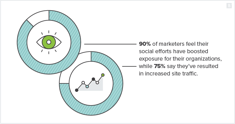 - 90% of marketers feel their social efforts have boosted exposure for their organizations, while 75% say they’ve resulted in increased site traffic.