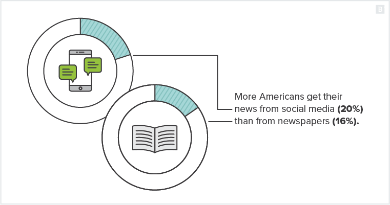 - More Americans get their news from social media (20%) than from newspapers (16%).