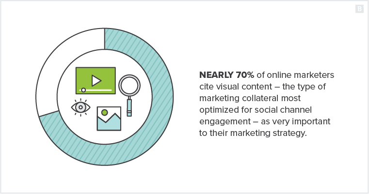 - Nearly 70% of online marketers cite visual content – the type of marketing collateral most optimized for social channel engagement – as very important to their marketing strategy.