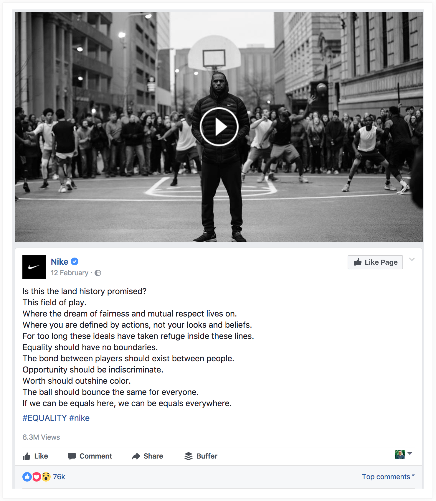With that in mind, a useful tactic is to mix text and pictures to take advantage of Facebook’s relatively large character limit and engage the audience in multiple ways. Nike did this in a spot featuring LeBron James, which was accompanied by a short poem that wouldn’t have fit on platforms such as Twitter.