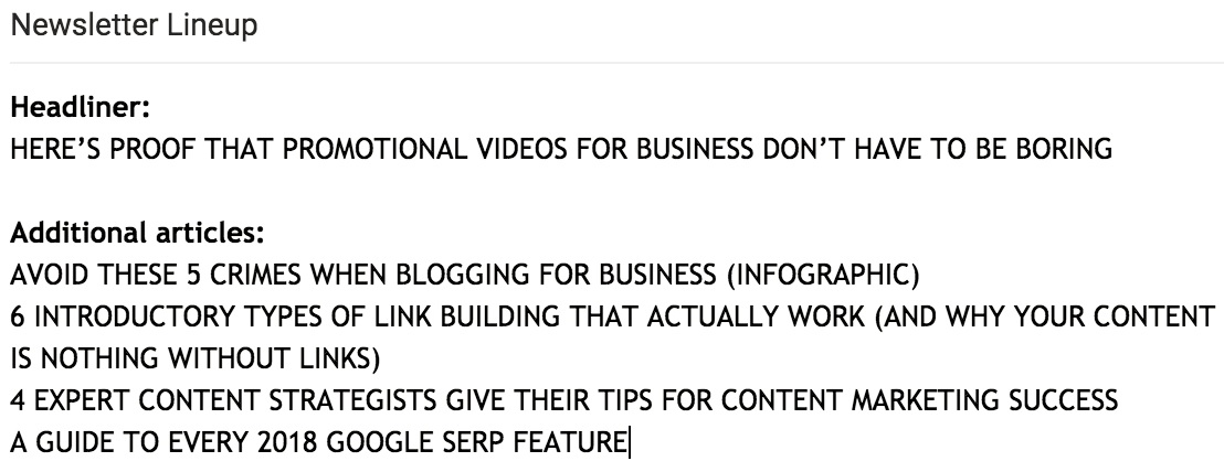 Your newsletter content is the crux here. Traditional newsletters may contain a mix of text-based links and images that direct readers to a blog page. Other newsletter styles may be heavy on authentic photography or design. Here’s a rough sketch of one of our newsletters where we first listed out the content that would go into the email, before we began formatting: