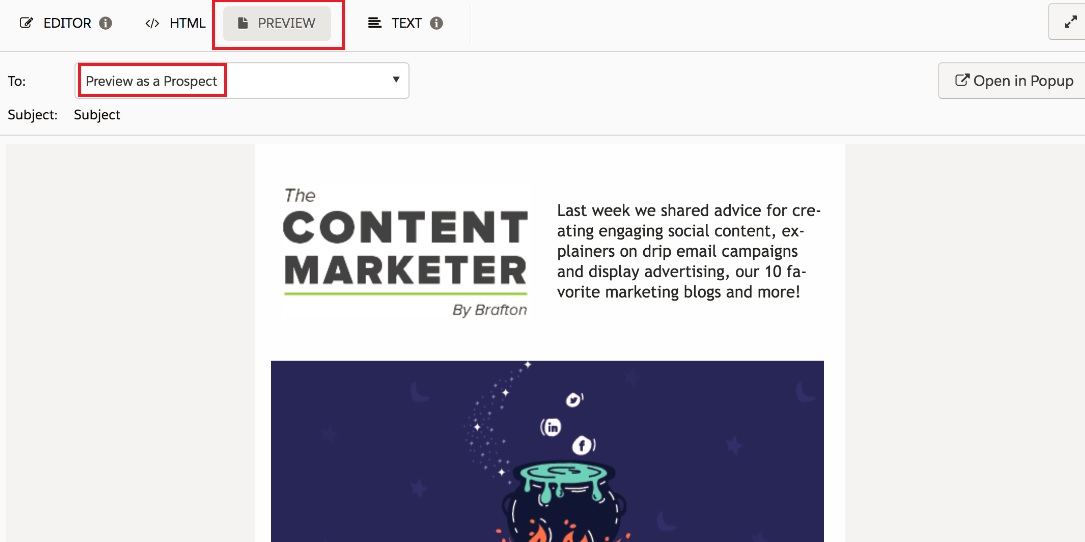 Use the “Preview” function in your email platform to accomplish this. In Pardot, you’ll see:
