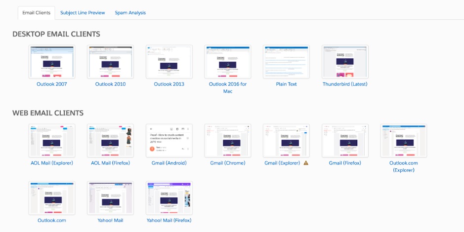 Your subscribers will be using many different types of email clients, and not all of them will feature your newsletter exactly as it appears on your screen. Running a “new render” test shows you how each email client in your email list will display your newsletter, as seen below: