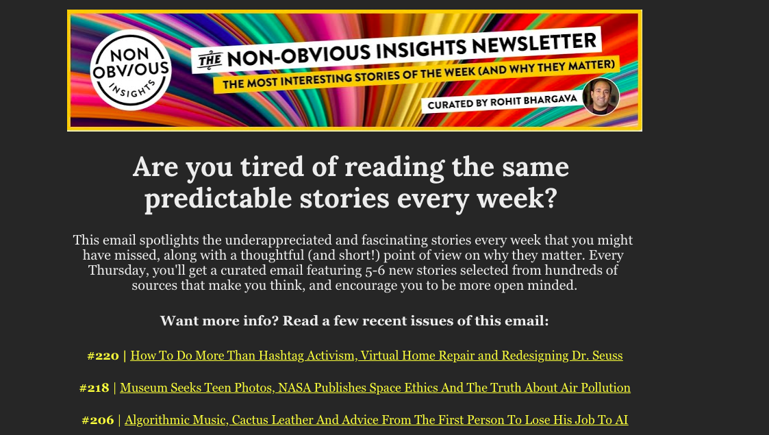 Rohit Bhargava trawls through hundreds upon hundreds of articles, guest blogs, press releases, critical-thinking pieces and other sources to deliver the best of the best to his loyal email newsletter subscribers. Non-Obvious Insights is curated through this haystack method to bring deep knowledge and innovative ideas to the surface. Bhargava does the legwork so you don’t have to.