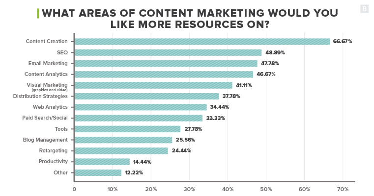 After content creation, the areas requiring more resources are SEO (49 percent), email marketing (48 percent) and content analytics (47 percent), respectively.
