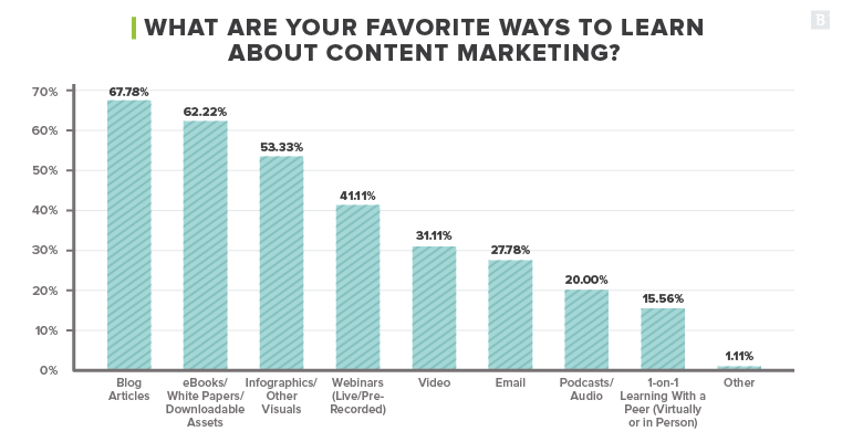 - The best way to learn about content marketing is through blog articles. Most of our respondents (68 percent) noted that they like to learn about content marketing via blogs. A close second (at 62 percent) preferred eBooks, white papers and other downloadable assets.