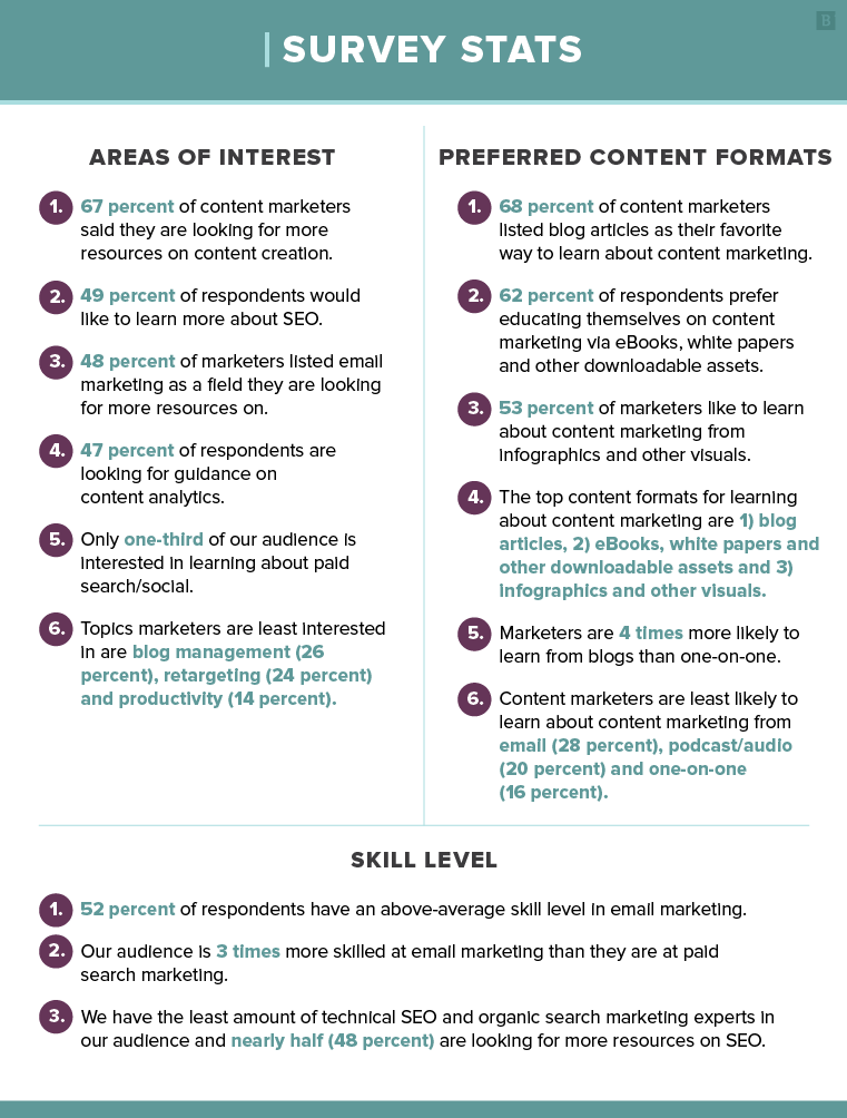 Paired with the knowledge that a significant proportion of our respondents are hungry for more content around email marketing and visual marketing, we now know we can create more in-depth content in those areas.