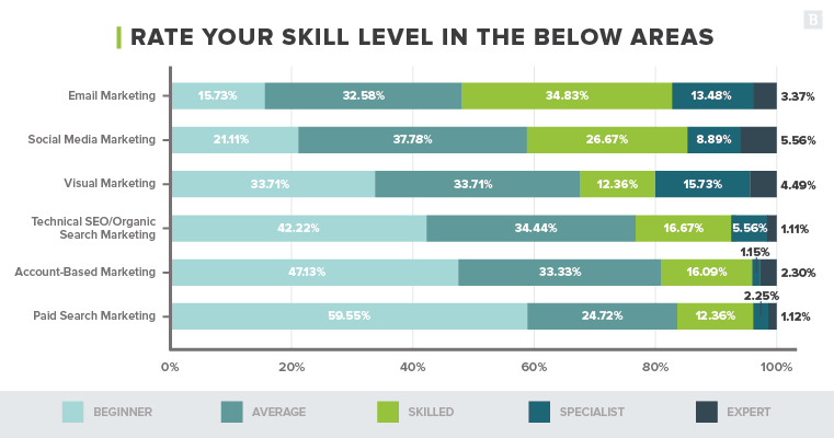 In our third question set, we asked respondents to rate their skill level in various areas of marketing (email marketing, social media marketing, visual marketing, technical SEO, ABM and paid search marketing) on a scale from beginner to expert.