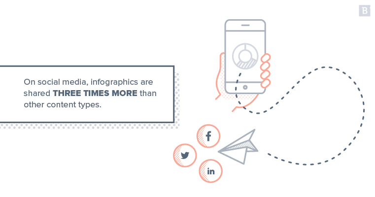 Infographics are a cornerstone of content marketing, and they add branded design elements to your company’s image and assets. On social media, infographics are shared three times more than other content types.