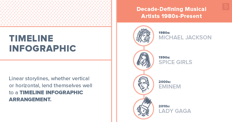 Linear storylines, whether vertical or horizontal, lend themselves well to a timeline infographic arrangement.