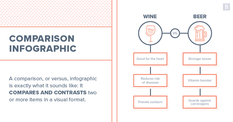 A comparison, or versus, infographic is exactly what it sounds like: It compares and contrasts two or more items in a visual format. This design is often a side-by-side arrangement or contains several columns of information.