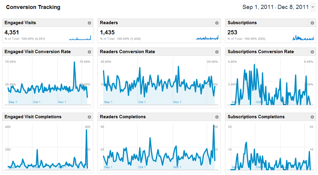 This example, courtesy of Moz, highlights a custom dashboard built to track conversions from month to month. It’s easy for marketing executives to spot important trends like spikes in conversion rates without having to wade through a bunch of statistical data.