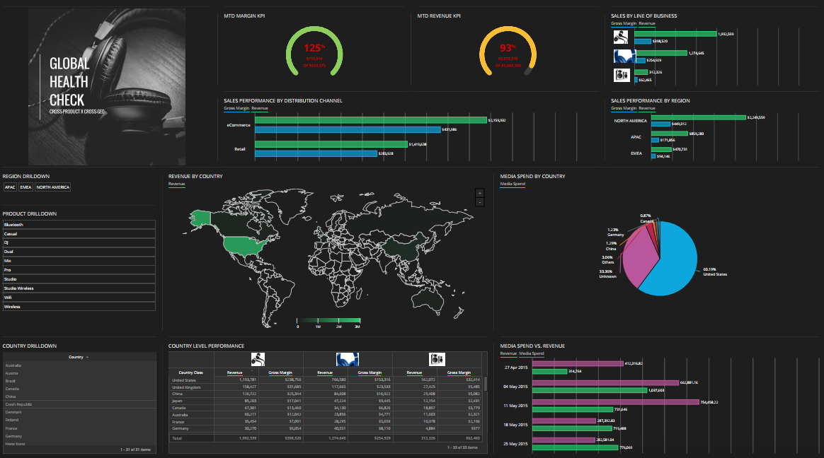 Marketing dashboards offer visual representations of key marketing metrics and give marketers — and more importantly, their managers — a quick overview of the status of your marketing campaigns. Marketing analytics and KPIs can cover a lot of ground, from tracking marketing spend across different regions to monitoring conversion rates and sales revenue.