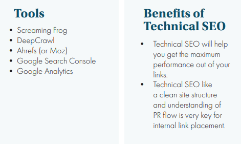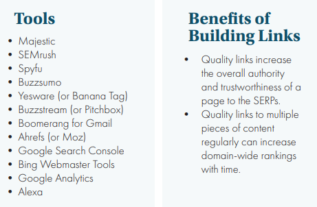 At the end of each chapter, SEJ provides a practical breakdown of both the benefits and recommended tools of a given link-building tactic: